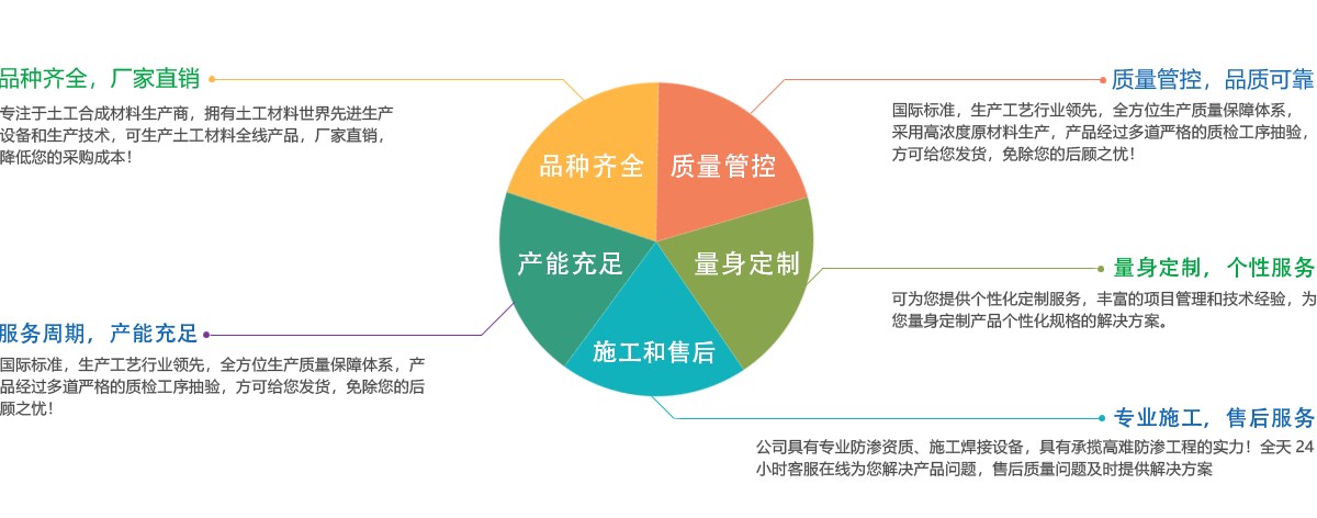 公司所有產(chǎn)品均采用國際標準組織生產(chǎn),并經(jīng)國家、市技術監(jiān)督局采標驗收,生產(chǎn)工藝及水平全國領先,屬國內(nèi)優(yōu)等水平,實物質(zhì)量達到國際先進水平。經(jīng)用戶、施工單位使用證明,質(zhì)量穩(wěn)定可靠、施工方便、價格合理、售后服務完善。產(chǎn)品主要應用于農(nóng)業(yè)、海綿城市建設、公路、鐵路、垃圾填埋場防滲,水利、電力、水土保持及環(huán)境綠化與基礎建設領域,已被廣泛應用于高速公路、鐵路、垃圾填埋場等多項國家重點工程,受到工程界專家及廣大用戶的一致好評。